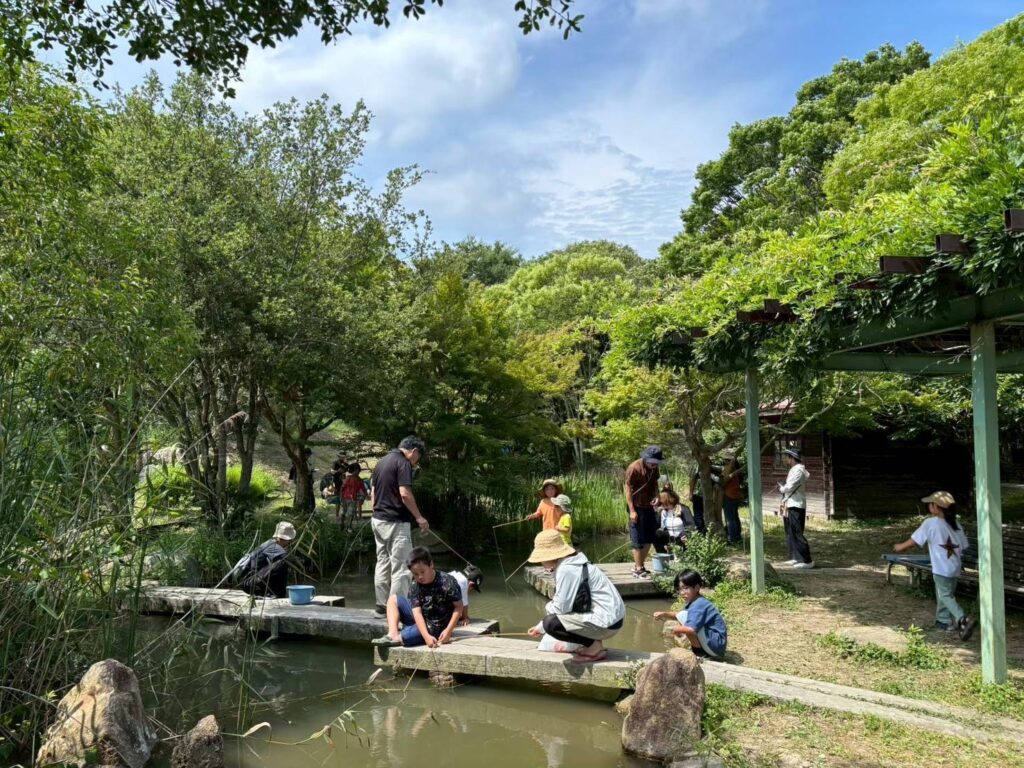 厳しい暑さが心配されましたが、当日は少し過ごしやすい気候の中、西区の「神出自然教育園」で田植え体験を行いました。
