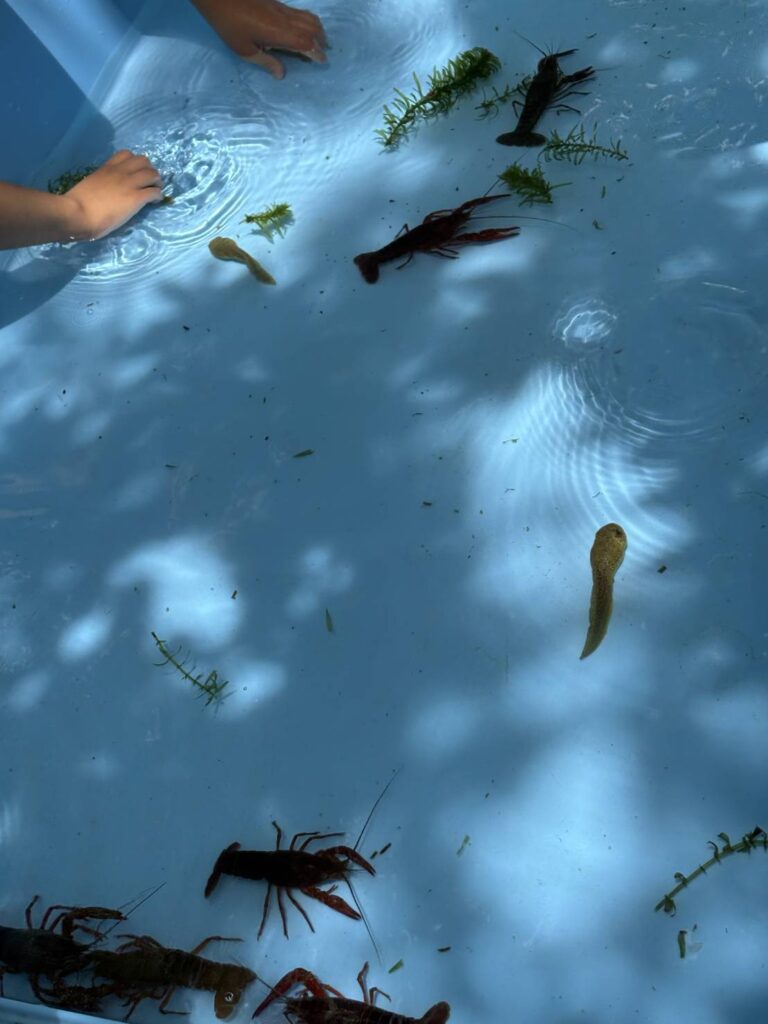 思ったほど泥んこにはならず少し拍子抜けでしたが、田植えの後は、素晴らしい蝶の標本を見学したり、スルメを餌にザリガニ釣りに大興奮したり、園内を散策したりと、有意義で楽しい体験となりました。